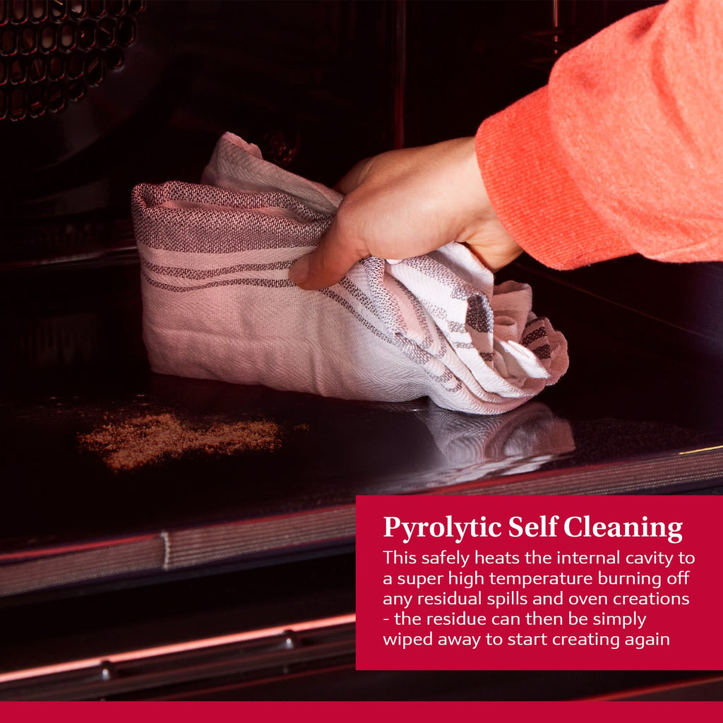The pyrolytic cleaning function uses high temperatures to reduce grease and spatterings into ash. When the oven has cooled simply wipe off and the oven is as good as new.